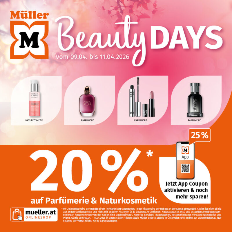 *Im Onlineshop wird der Rabatt direkt im Warenkorb abgezogen. In der Filiale wird der Rabatt an der Kassa abgezogen. Aktion ist nicht gültig auf andere Aktionspreise und nicht mit anderen Aktionen (z. B. Coupons, %-Aktionen, Naturalrabatte, etc.) und aktuellen Angeboten kombinierbar. Ausgenommen von der Aktion sind Gutscheinkauf, Make up Services, Tragetaschen, kostenpflichtiges Verpackungsmaterial und Pfand. Gültig vom 09.04. – 11.04.2026 in allen Müller Filialen sowie Müller Beauty Stores in Österreich und online auf www.mueller.at. Nur solange der Vorrat reicht. Keine Barauszahlung.
