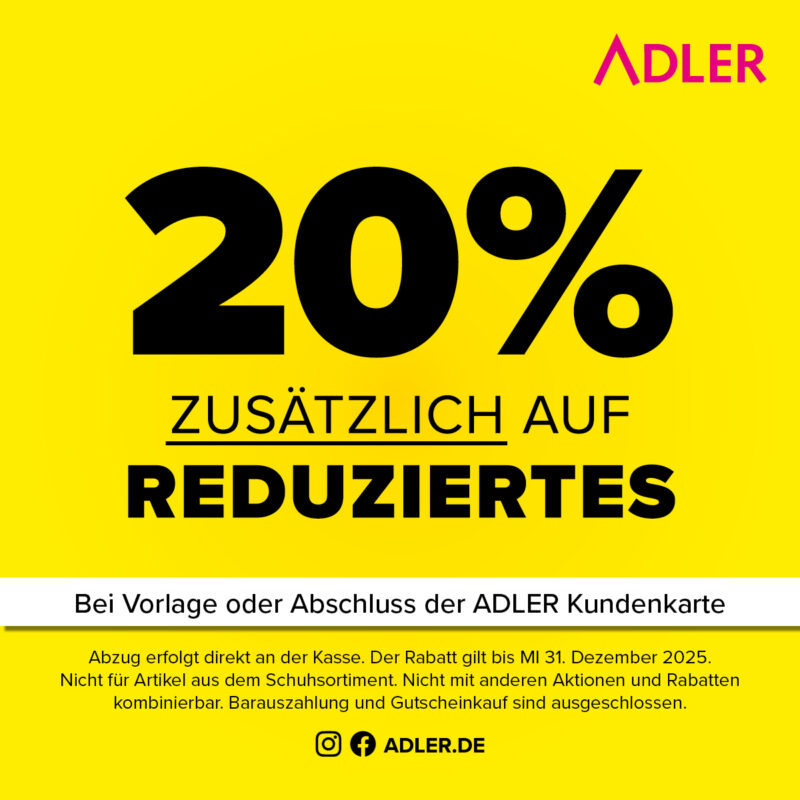 Einfach ADLER Kundenkarte vorzeigen oder abschließen und 20% sparen.