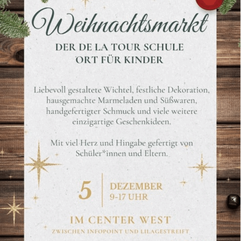 Weihnachtsmarkt der De La Tour Schule Ort für Kinder findet am Freitag, 05. Dezember von 09:00-17:00 Uhr zwischen Infopoint & Lilagestreift statt.